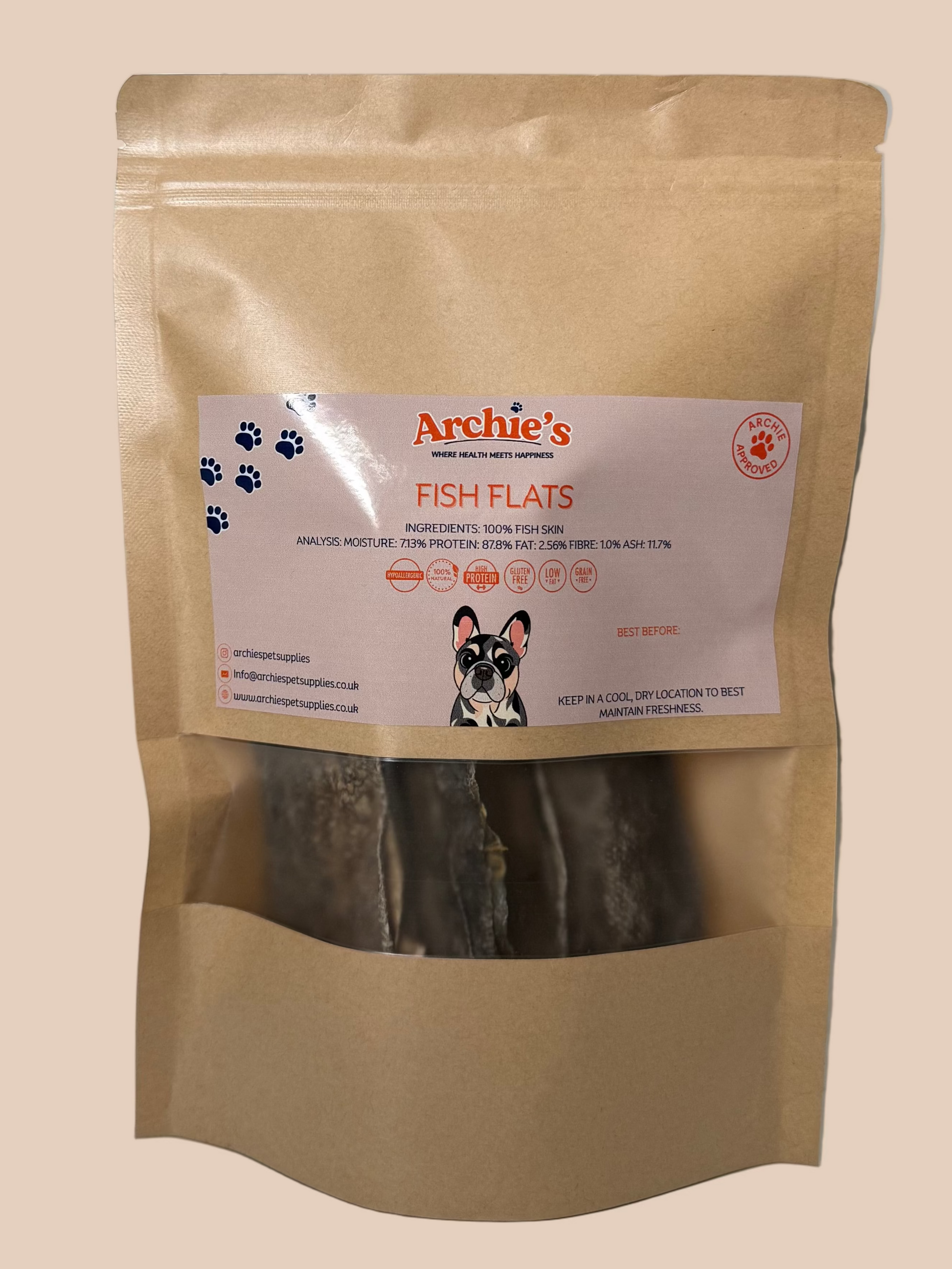 Archie's Dried Cod Fish Skin Flats are light sea fresh treats made from 100% pure cod skins. Each piece is gently air dried to create a healthy, flavourful and satisfying chew for dogs. Rich in natural proteins, omega oils, and amino acids, these long lasting chews help maintain healthy skin, supple joints, and a shiny coat. They also support brain and eye health and are naturally hypoallergenic, as well as free from grains, wheat, and gluten.