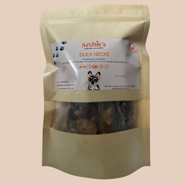 Archie's Duck Necks are a perfect single ingredient chew for dogs that like a chew that will support their health. Made of 100% air dried duck neck and free from grain and gluten these chews are packed with protein, calcium, and phosphorus, which aids strong bones, teeth, and development of muscles.