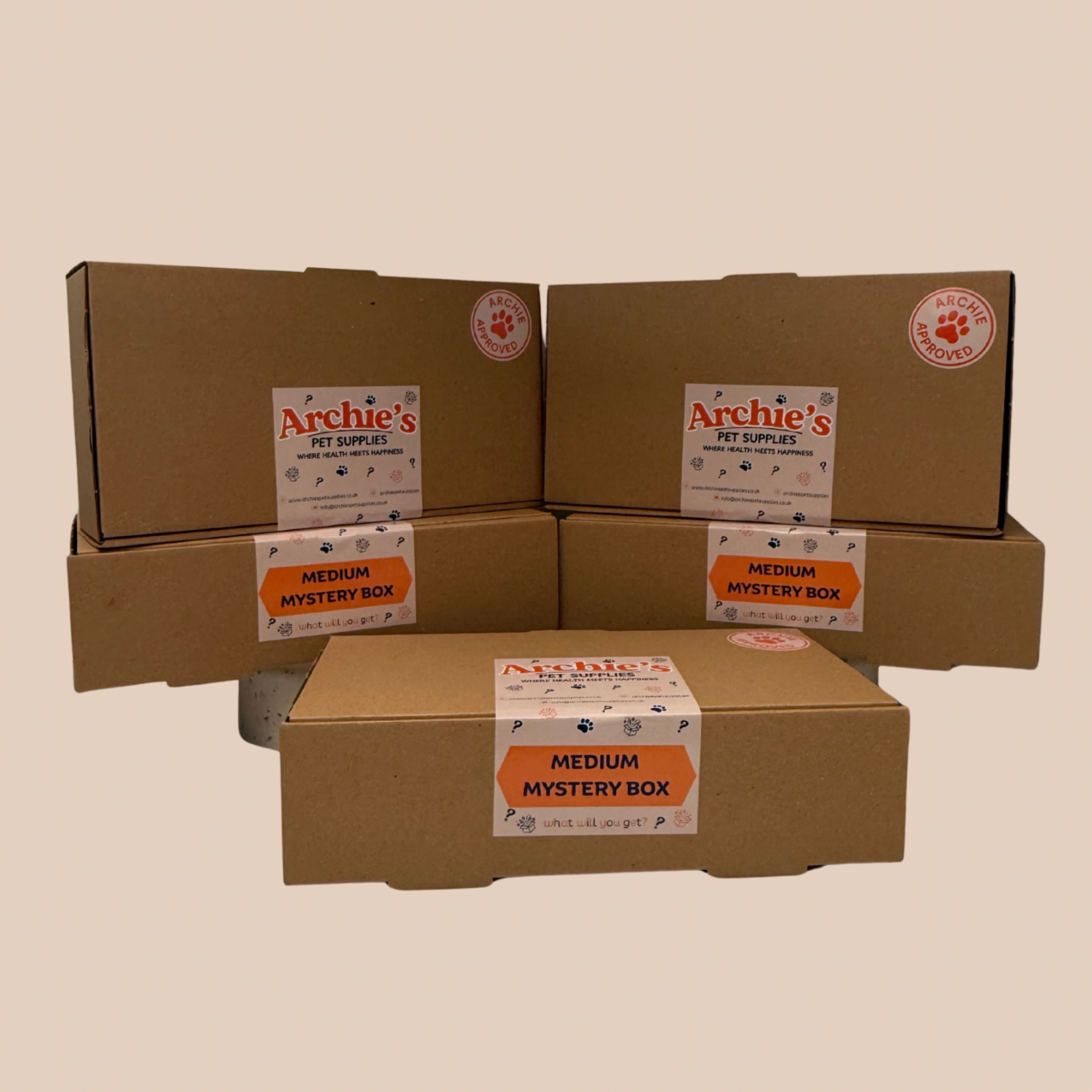 That's the surprise! Every box is a pet supply delight box of our trusty Archie's Pet Supplies brand packed full of goodies at a fabulous savings. Every single one of them is a surprise, so your pet gets to experience the thrill of a brand new mystery every time